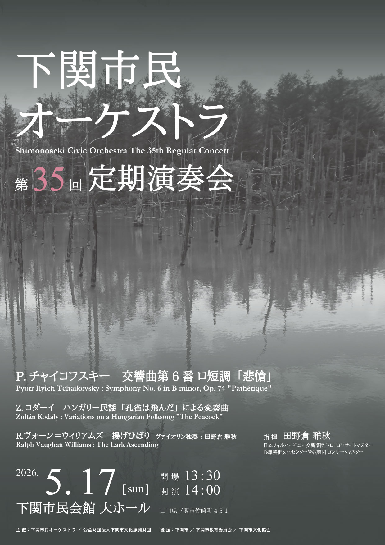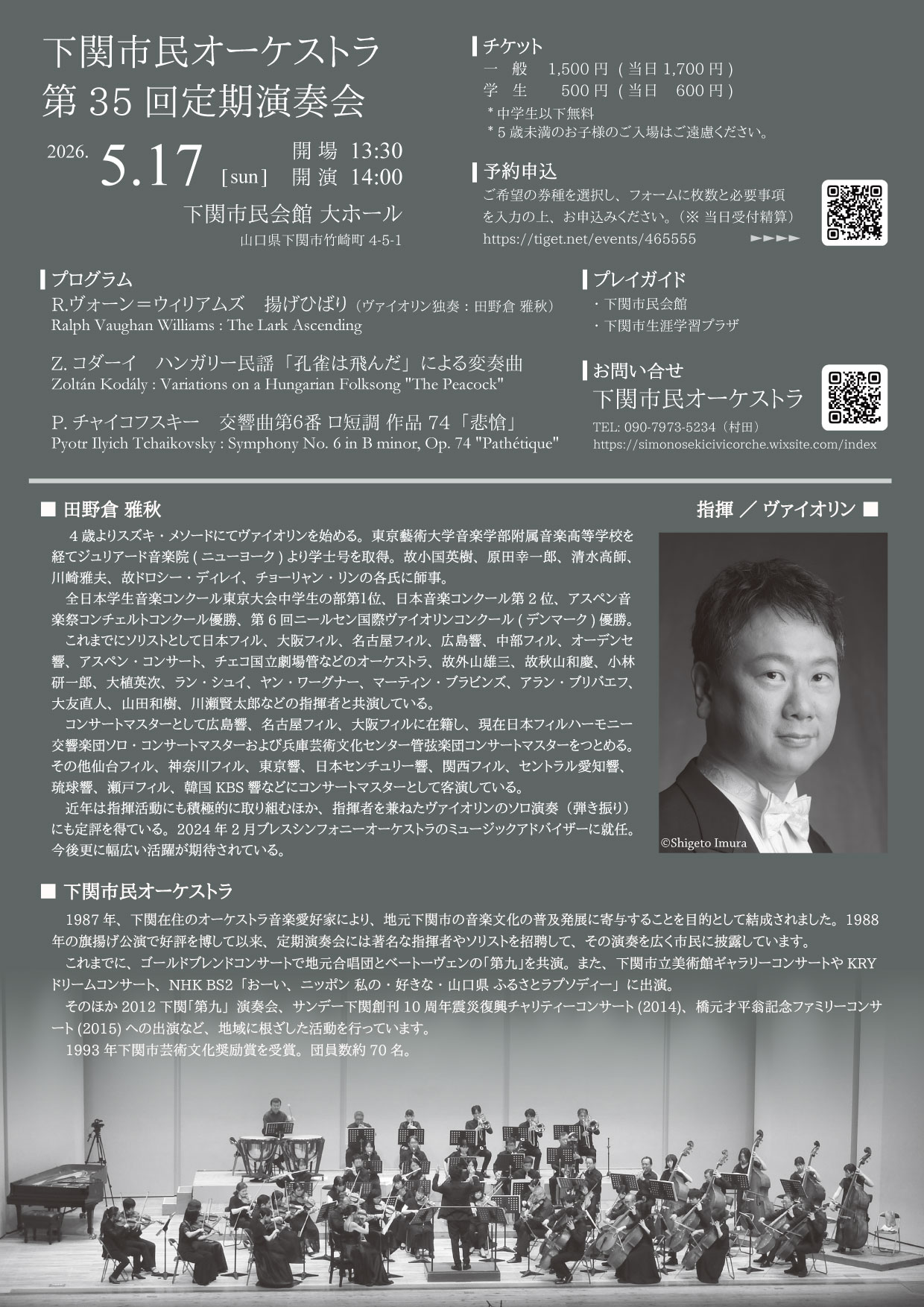 第35回下関市民オーケストラ定期演奏会 時間:14:00開演 13:30開場 会場:下関市民会館 大ホール 入場料:一般1,500円(当日1,700円) 学生500円(当日600円) 中学生以下無料 5歳未満のお子さまの入場はご遠慮ください。 曲目:ヴォーン・ウィリアムズ/揚げひばり 指揮・ヴァイオリン:田野倉 雅秋